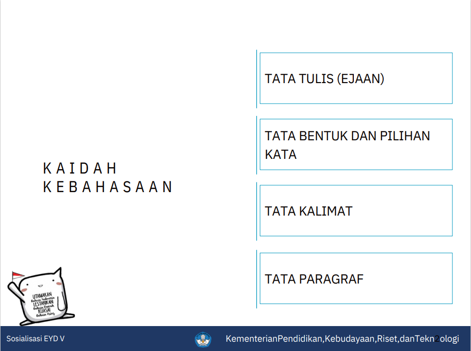 Sebelumnya kita sudah terbiasa menggunakan PUEBI dalam penulisan, namun sejak 16-08-2022 Badan Bahasa Kemendikbudristek telah meluncurkan ejaan terbaru yaitu Ejaan Yang Disempurnakan atau disingkat EYD yang merupakan revisi ke-V.
